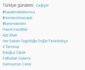 YanıtlaSilOnları kullanıcı kendisi yapamaz. Örneğin "Türkiye" kelimesini ele alalım. Türkiye kelimesinden belli bir zaman dilimi içerisinde milyonlarca kişi tarafından kullanılırsa o kelime TT listesine en çok bahsedilen kelime olarak geçer. Sen o kelimeyi içeren bir Tweet atınca ise senin Tweet'in de otomatik olarak "Türkiye" etiketi içinde yer alır. Yani en popüler konular ve kelimeler # işareti olmadan otomatik olarak sistem tarafından TT listesinde yer alıyor.